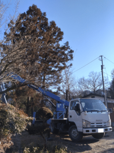10m超の大木のため高所作業車を使っての工事を行いました。